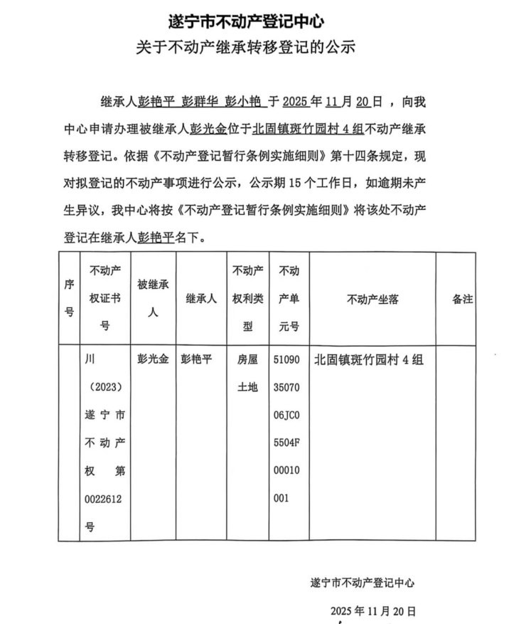 遂宁市不动产登记中心关于不动产继承转移登记的公示(彭艳平)