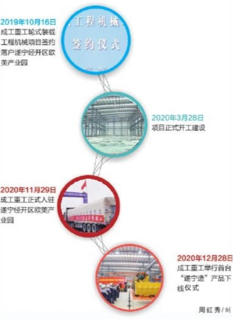 2019年10月16日,成工重工轮式装载工程机械项目签约,作为国内领先的重型装备行业龙头企业的成工重工机械有限公司落户遂宁经开区欧美产业园。成工重工遂宁新基地开工建设以来,遂宁市委、市政府及遂宁经开区管委会主动作为,在要素保障、政策支持、配套服务上下足了功夫,基地保持“一天一小变,一月一大变”的推进速度。2020年12月28日,成工重工举行首台“遂宁造”产品下线仪式。“遂宁一号”下线,填补了我市重型机械装备制造空白,为我市机械与装备制造业发展注入强劲动能。