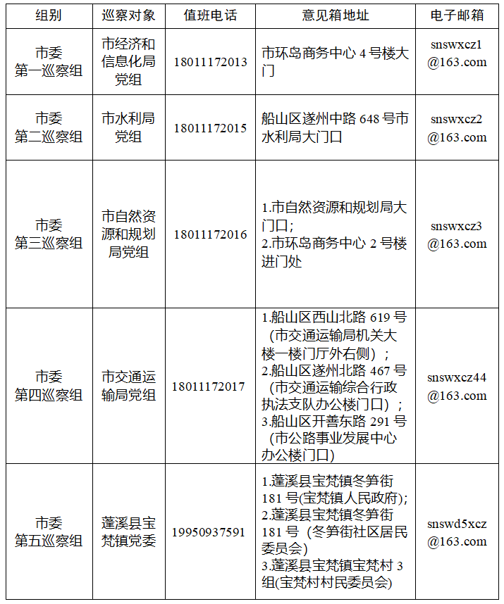巡察期间,各市委巡察组设置了值班电话、电子邮箱、意见箱和“四川码上巡”二维码。巡察组主要受理反映被巡察党组织领导班子及其成员、下一级党组织或内设机构、下属单位主要负责人在违反政治纪律、廉洁纪律、组织纪律、群众纪律、工作纪律和生活纪律等方面的问题反映。对其他不属于巡察受理范围的信访问题,将按照程序转交具体承担相关职能部门办理。