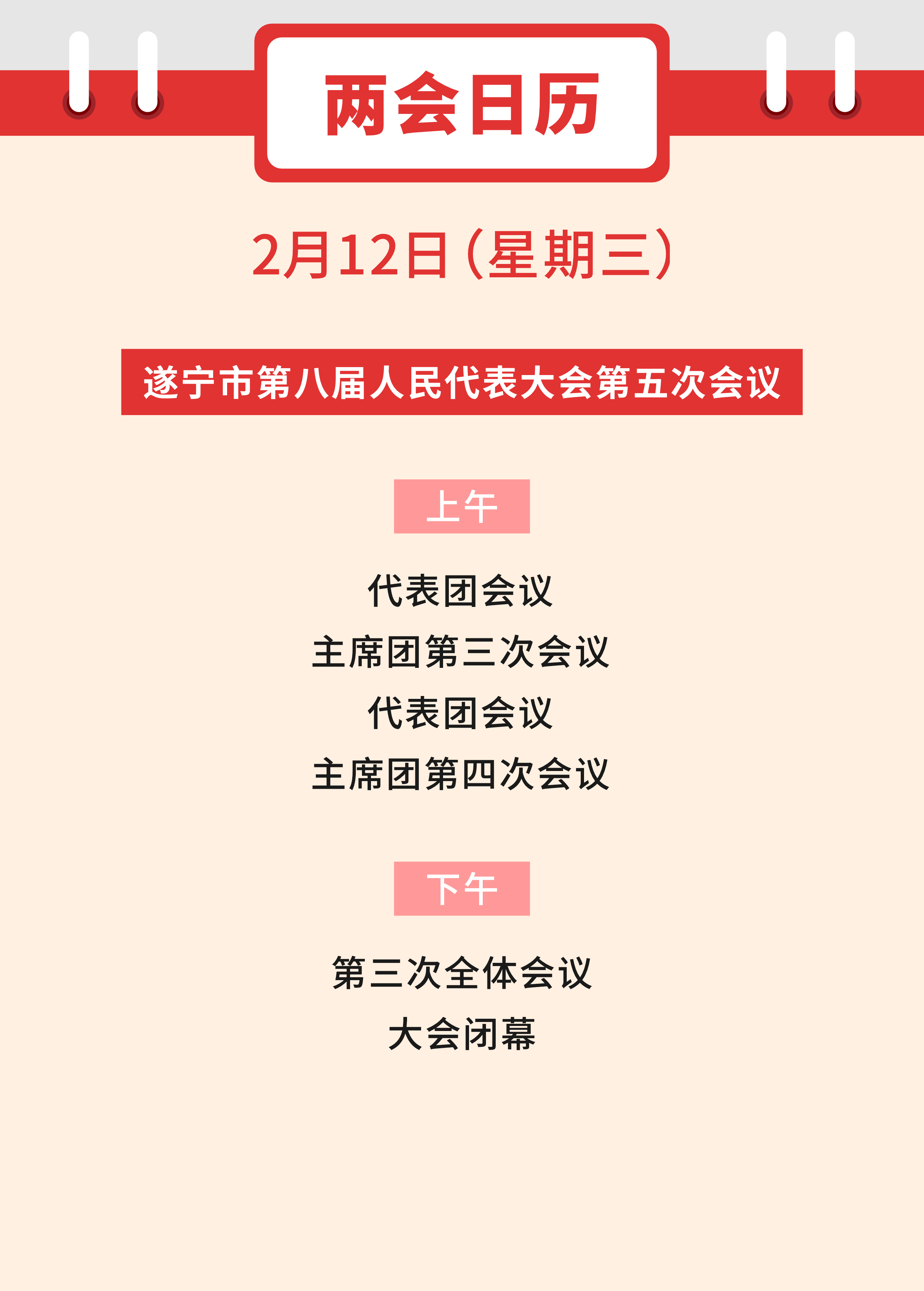 两会日历(2月12日)市八届人大五次会议上午:代表团会议、主席团第三次会议、代表团会议、主席团第四次会议下午:第三次全体会议(大会闭幕)点击链接,进入两会专题了解更多