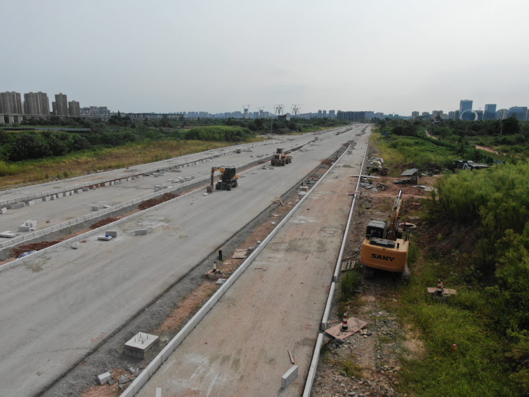 目前项目已完成路基清表,土石方施工完成约92%、有机质挂网边坡支护80%、雨污水管道及支管安装65%,电力通讯工程35%;联盟河桥梁完成桩基、承台、桥台、垫石挡块,挡土墙完成约75%;路灯工程管线敷设及包管完成18%、侧分带海绵城市完成20%、路床整形完成13%。