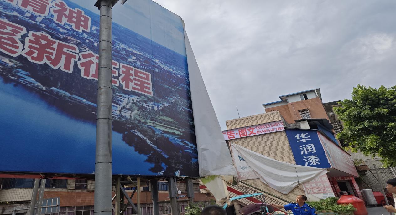 隐患:两处大型户外广告因未及时进行维护,均已出现破损,在大风天气极易脱落,对过往行人、车辆及周边设施的安全构成严重安全威胁。