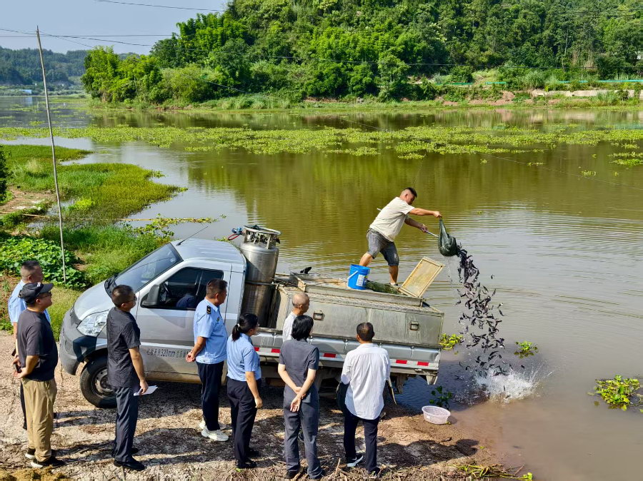 9月15日,大英县人民法院联合大英县人民检察院、大英县农业农村局在郪江水域开展生态补偿增殖放流活动,30000余尾鱼苗被有序放流。