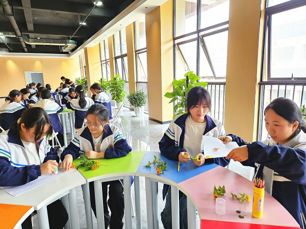 没有讲台、无需黑板。10时20分,大家纷纷涌进辅导中心崭新的团体辅导室。圆桌上,白卡纸、彩铅、胶水排成一条“生产线”。大家把采集来的花草贴成创意作品:有人用花草做成“花束”,有人将狗尾草化作“魔法棒”……欢声笑语中,大家表达出对生活的热爱。