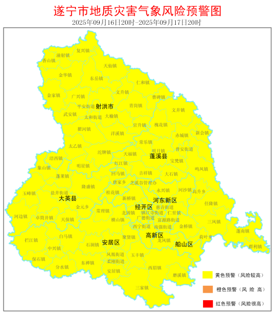 遂宁市自然资源和规划局与遂宁市气象局9月16日17时10分联合发布地质灾害气象黄色风险预警: