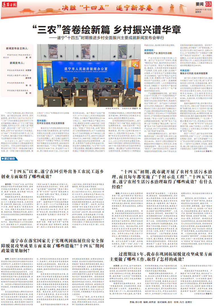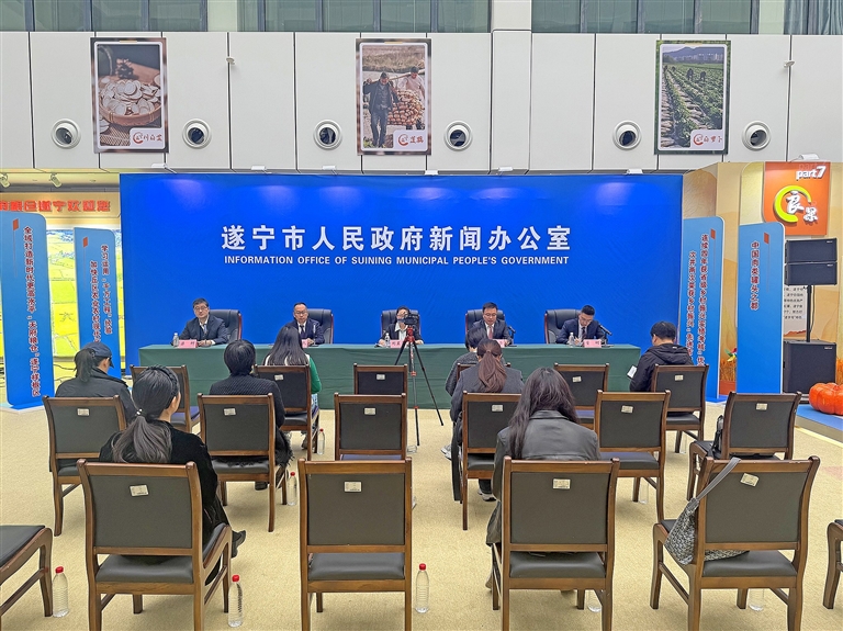 11月12日上午,遂宁“十四五”时期推进乡村全面振兴主要成就新闻发布会举行。市农业农村局副局长刘罡霏全面介绍了我市一体推动城乡融合发展、进一步缩小城乡差距的成果,展示我市“十四五”时期推进乡村全面振兴主要成就。