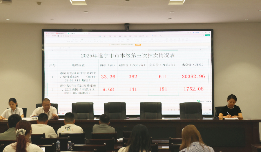 9月16日,2025年遂宁市市本级第三次土地拍卖会在市公共资源交易服务中心举行。竞拍现场,5家房地产开发企业争相竞价,成功竞拍两块土地,涉及面积43.04亩,成交金额共计22135.04万元。