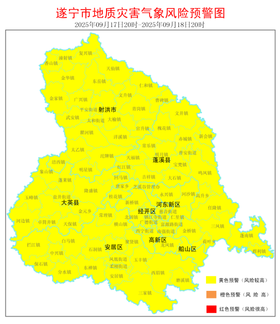 遂宁市自然资源和规划局与遂宁市气象局9月17日16时40分联合发布地质灾害气象黄色风险预警:
