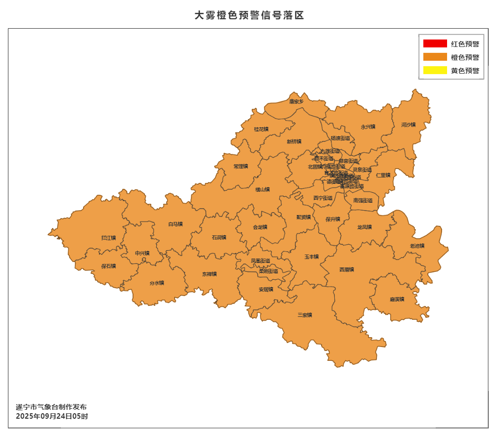 遂宁市气象台2025年09月24日5时50分发布大雾橙色预警信号:预计未来6小时我市船山区、安居区将出现能见度小于200米,局地小于50米的大雾天气。雾天行车,提醒广大驾驶员合理使用灯光,谨慎驾驶,防止交通事故的发生。